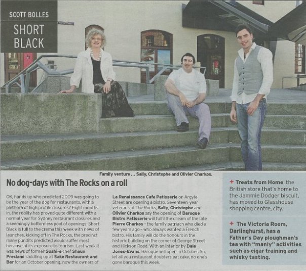 "La Renaissance Cafe Patisserie on Argyle Street are opening a bistro. Seventeen-year veterans of The Rocks, Sally, Christophe and Olivier Charkos say the opening of Baroque Bistro Patisserie will fulfill the dream of the late Pierre Charkos - the family patriach... So, let you all restaurant doubters eat cake, no one's gone baroque this week."