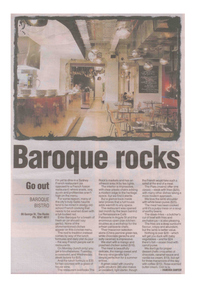 "Don't diss The Rocks - it's not all fluffy kookaburras and opalescent bling. Slide into Baroque and feast those peepers on a jewel-like display of patisserie. Beautiful desserts really are the major draw here, not that the rest of the smart, casual bistro menu is without its charms. An entree of duck liver and port parfait is generously proportioned, meltingly rich and deeply savoury, while grilled reef fish works well with its accompanying red claw yabby, mussels, kipfler potatoes and lobster bisque. However, a dish of grilled Bangalow pork tenderloin, crisp pig's ear, heirloom carrots and pear puree suffered from being tepid and a little dry, perhaps after languishing too long at the pass. To finish, the intriguingly named 'Zulu' turns out to be a dome-shaped confection of velvety Valrhona chocolate mousse layered with salted caramel ganache on a biscuit base, with berry puree, a mini macaron and a quenelle of vanilla ice-cream. Phew."
